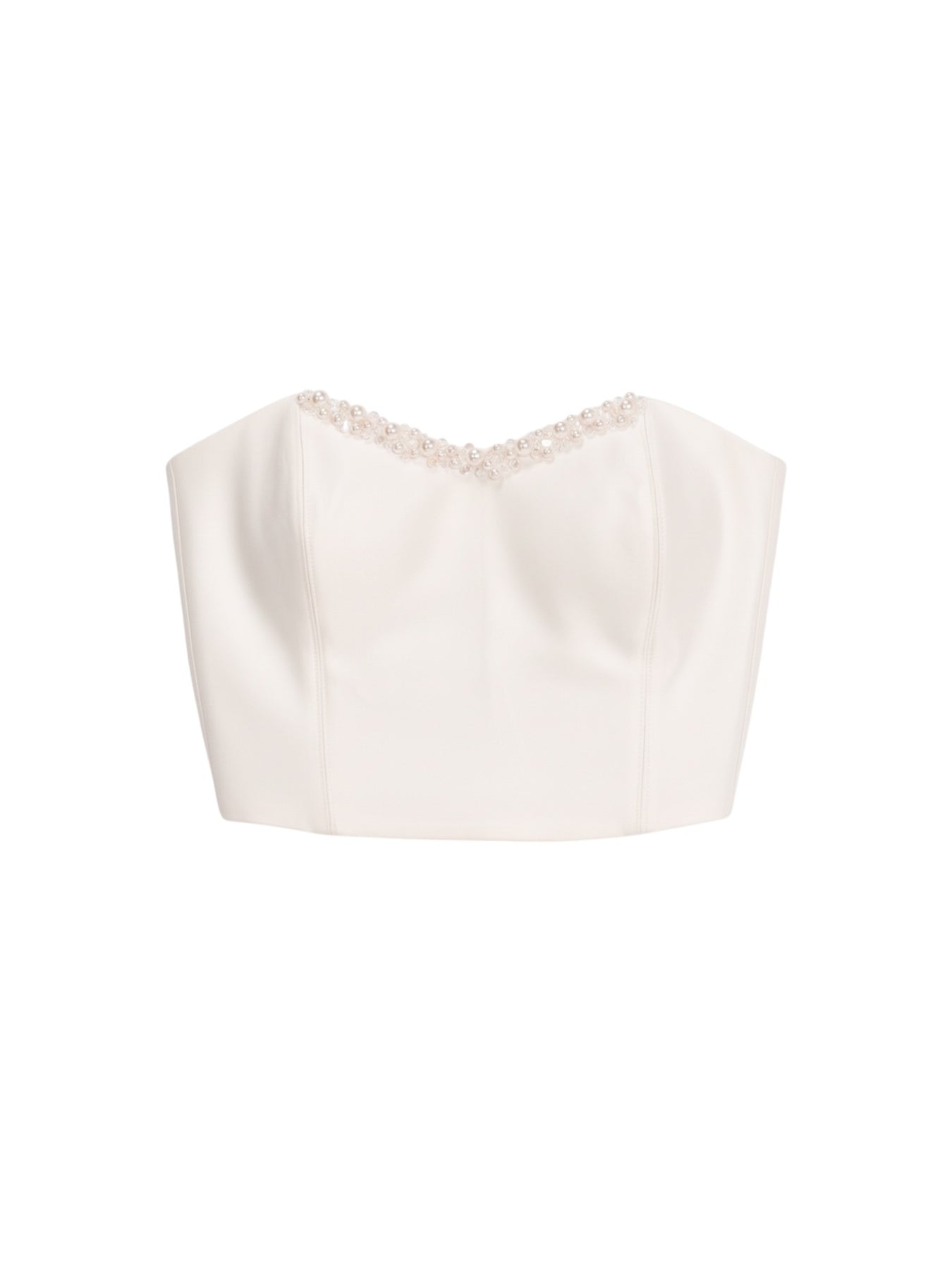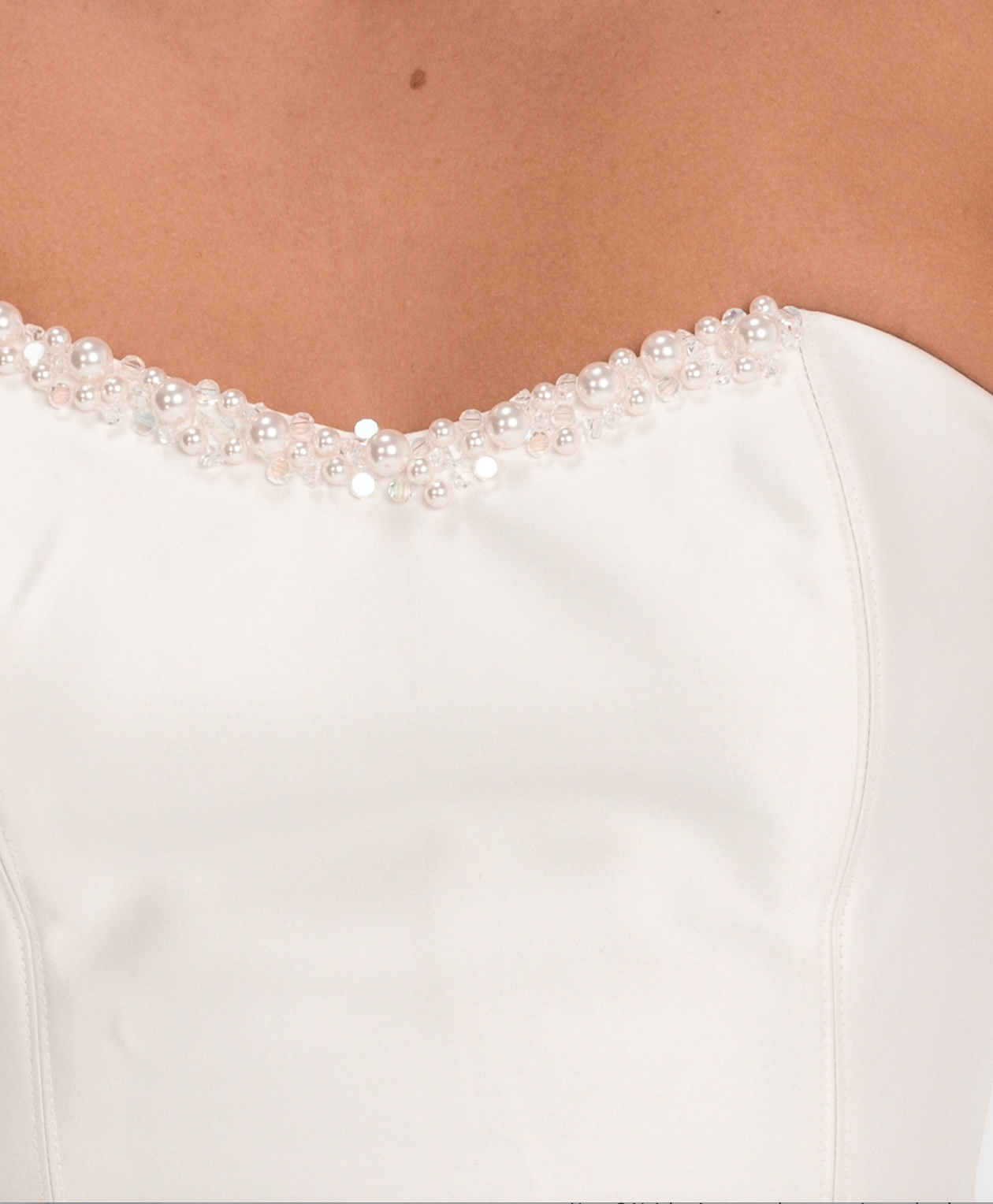 A fusion of elegance and structure, this strapless corset top is crafted from luxurious crepe fabric, offering a sculpted fit that accentuates the silhouette. The delicate hand embroidery of pearls and crystals along the neckline adds a touch of refinement and subtle shimmer, making it the perfect statement piece for sophisticated occasions.